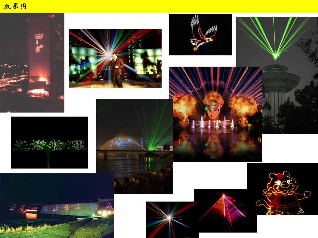 广泛应用于:城市广场亮化美化,激光水幕喷泉,激光水秀表演,大型电视演播厅、剧场、大型歌舞厅以及广场、体育场的激光表演,激光广告等领域 。